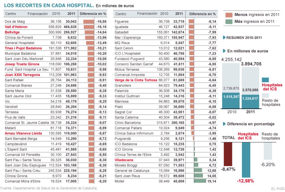 Recortes en los hospitales catalanes; comparativa de los años 2010 y 2011 | Fuente: Departamento de Salud de la Generalitat de Catalunya publicado por El País