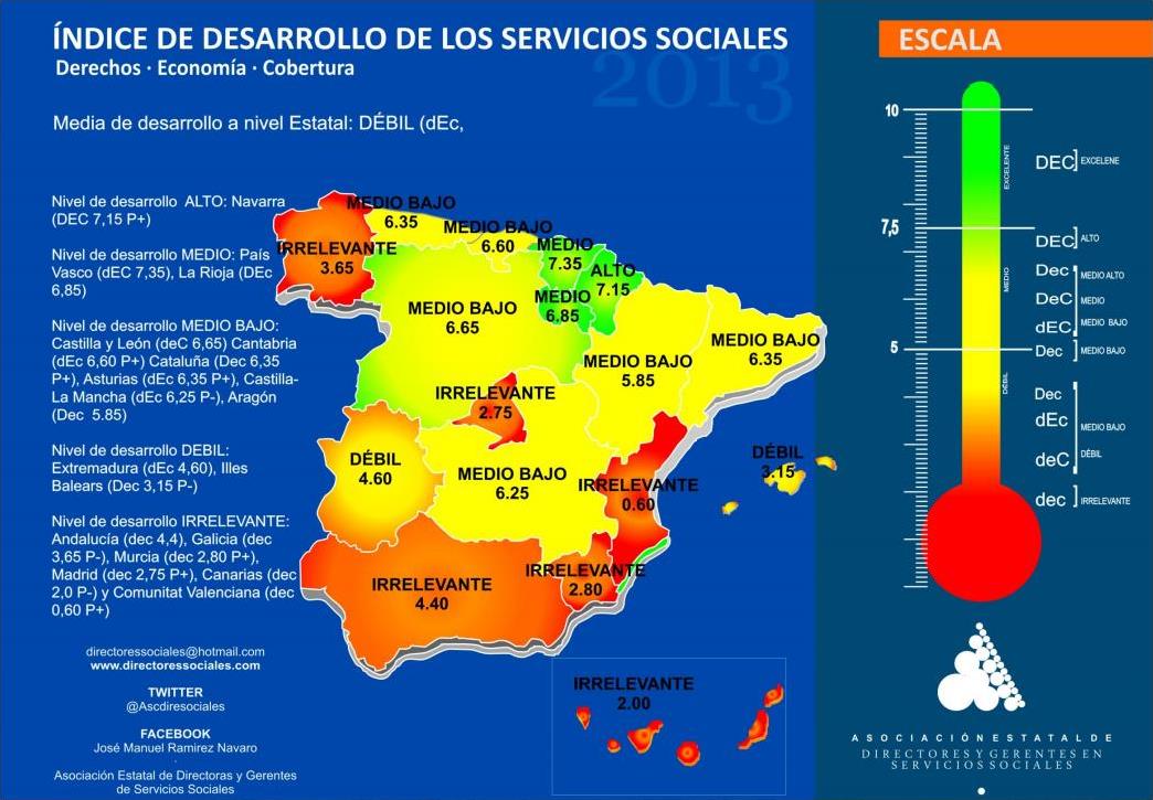 Mapa del índice de desarrollo de los servicios sociales | Fuente: Asociación Estatal de Directores y Gerentes de Servicios Sociales