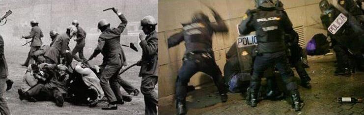 (des)Memoria de cuatro décadas de neón con fondo de lodo y podredumbre. Izquierda: foto de Manel Armengol; manifestación del 1 de febrero de 1976 en Barcelona, convocatoria por la libertad, la amnistía y el estatuto de autonomía. Derecha: foto difundida por el periodista Jaime Alekos en twitter; manifestación del 26 de marzo de 2015 en Madrid, convocatoria contra la aprobación de la Ley Mordaza.